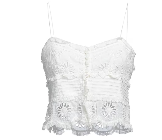 귀여우면서도 여름에 입기 좋은 탑을 찾는다면 ISABEL MARANT 탑은 어때? 깔끔한 화이트 컬러에 플라워 패턴이 들어가서 귀여운 느낌과 러블리한 느낌을 주었어. 평소에는 나시 탑으로 입기 부담스럽다면 얇은 반팔이나 봄, 가을에는 긴팔과 함께 뷔스티에 스타일로 입기으면 데일리 코디로도 입기 좋을 것 같아. 또한 화이트 컬러이기 때문에 어떤 하의와도 받쳐입기 좋다구. 탑 하나로 다양한 스타일링을 하고싶다면 ISABEL MARANT 탑을 추천해.