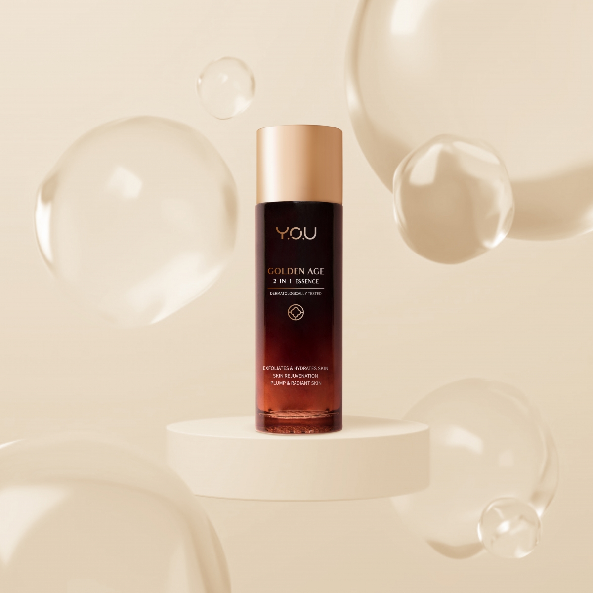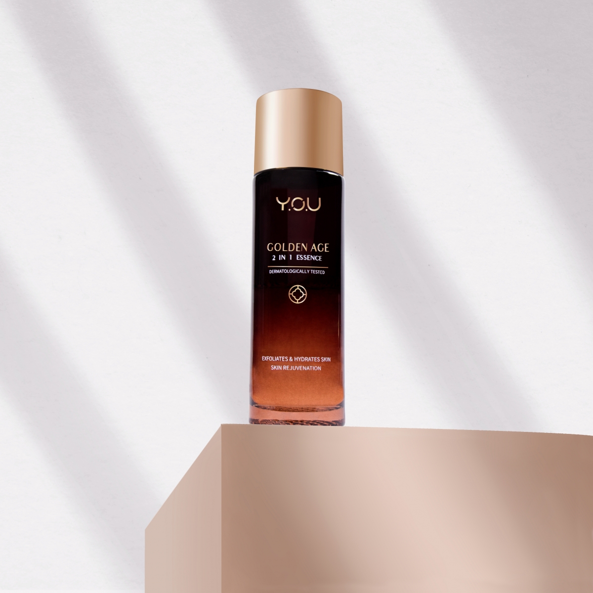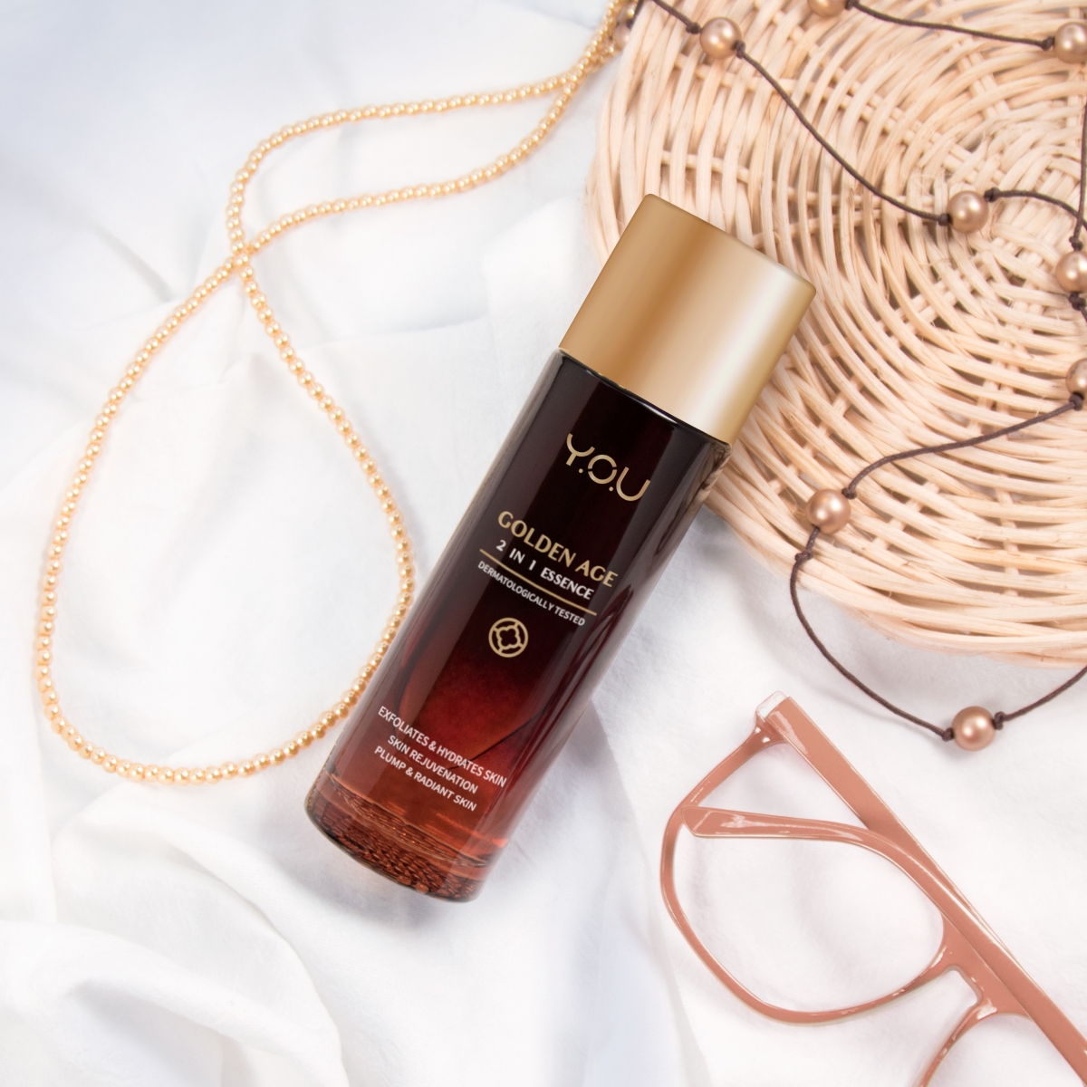 Y.O.U BEAUTY | Golden Age 2 in 1 精华水全面升华富含红石榴以及乳酸的高效成分,一瓶集结了 8 个不同的护肤卓效,有助代谢老废角质,使皮肤更加透亮滑嫩~含水量高的配方也能充当肌肤的蓄水库,提供源源不绝的水源力量,增强皮肤弹嫩度同时还具备镇定用途,超有感舒缓将肌肤所有负能量统统清零、粗大毛孔问题也能一并带走,令皮肤焕发健康无暇的光泽。清爽型的水润质地在抗老方面也有显著功效,使肌肤更加年轻细滑,一瓶精华水在手走天下告别繁琐护肤过程。