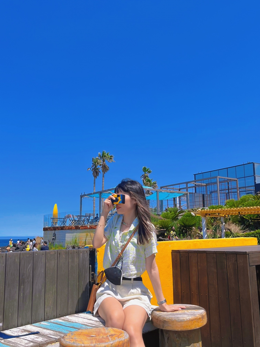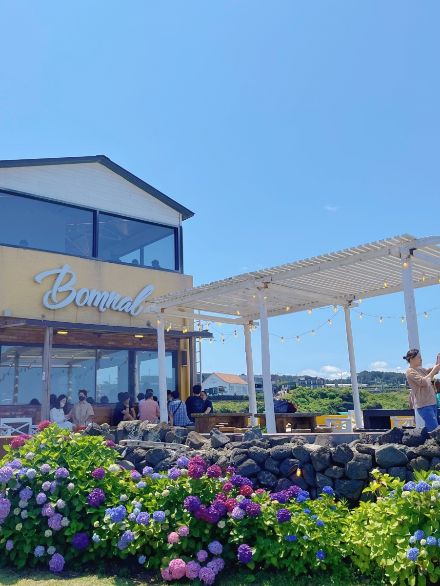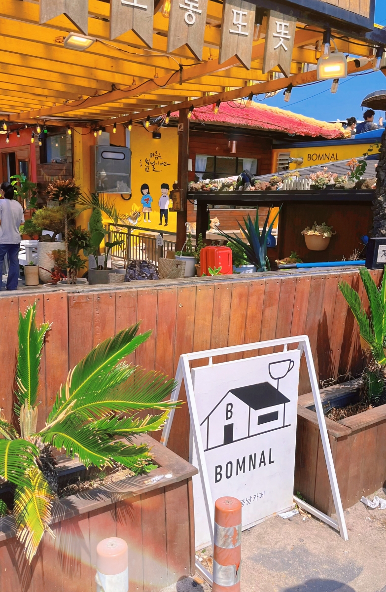 网红打卡热点:春日咖啡(봄날카페/BOMNAL cafe)鲜黄色的建物搭配周边的绿色植物,除了景色梦幻,沿途有更有许多超美的特色主题咖啡馆,吹海风悠闲喝咖啡欣赏整片疗愈蔚三色蓝海,网美照轻松GET!