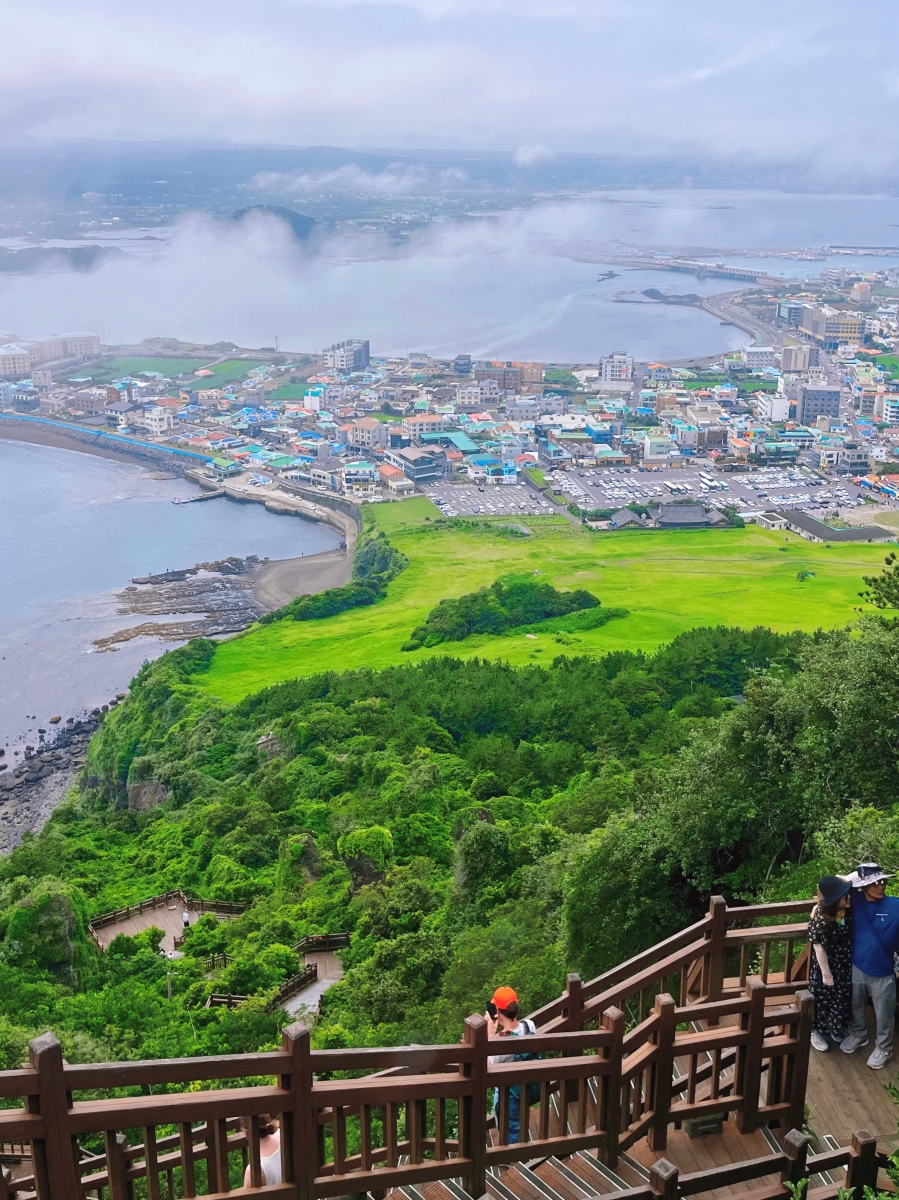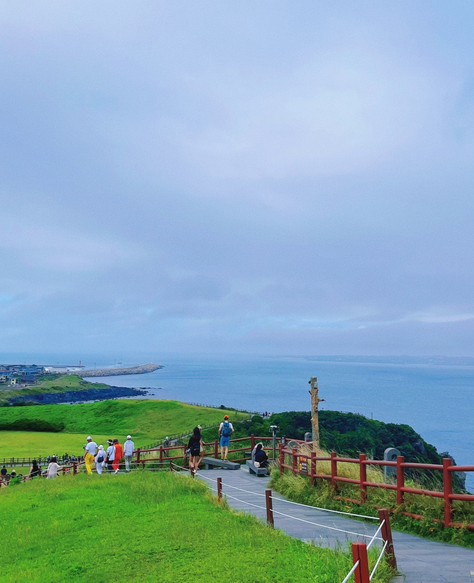 沿着阶梯顺势攻顶,沿途有许多造型特别的火山岩和背后的故事。登上山顶后更能眺望济州岛的辽阔景致和蔚蓝海洋,海天融为一色,绝美的悬崖临海美景,山脊上的青葱草原等尽收眼底。