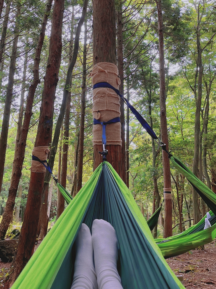 小编更有幸能够参与治愈项目,在森疗师的带领下躺卧在森林吊床放松、冥想。森疗师引导放松有技巧,运用敲击颂钵发出的音频对身体和心灵能起到疗愈作用!闭目调整呼吸,声音安静悠远在,伴随风吹婆娑起舞的树叶虫鸣声,聆听大自然的声音!