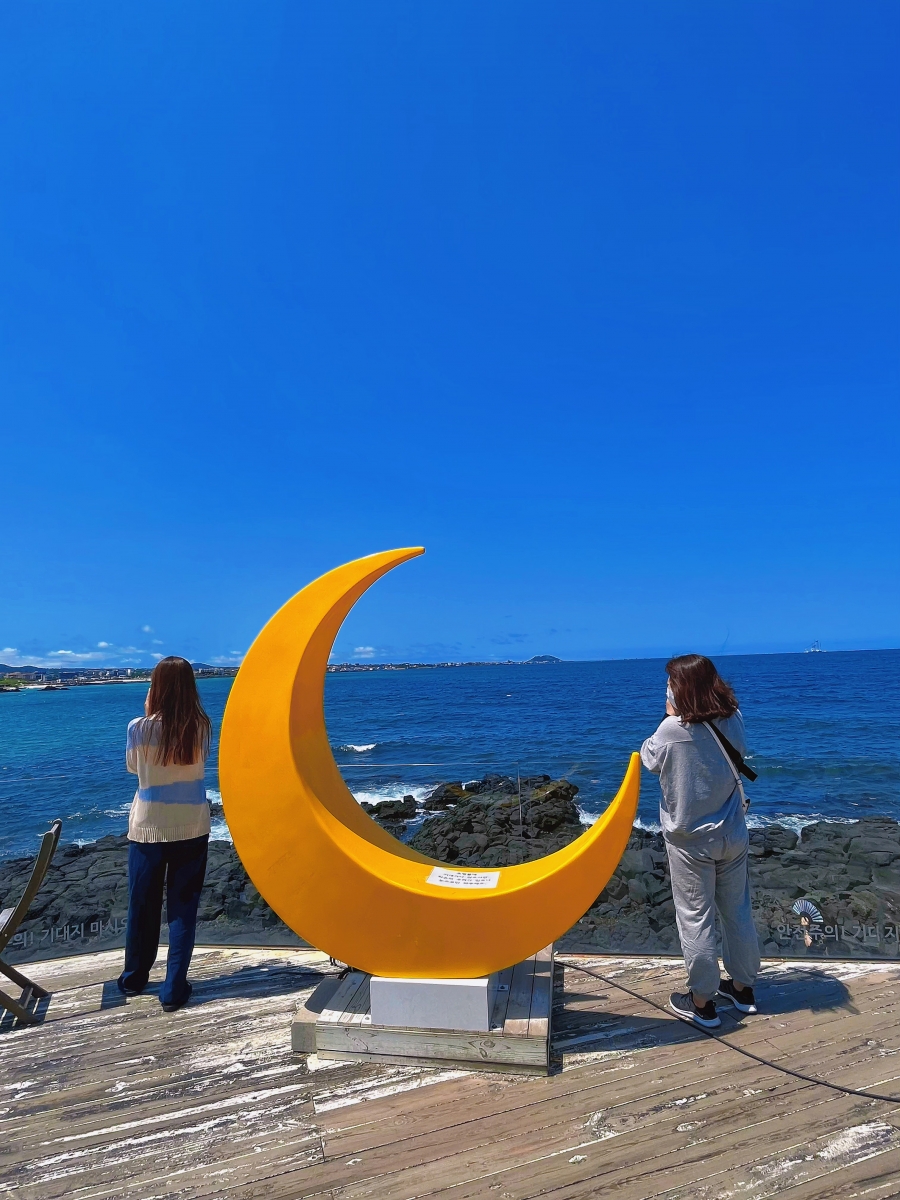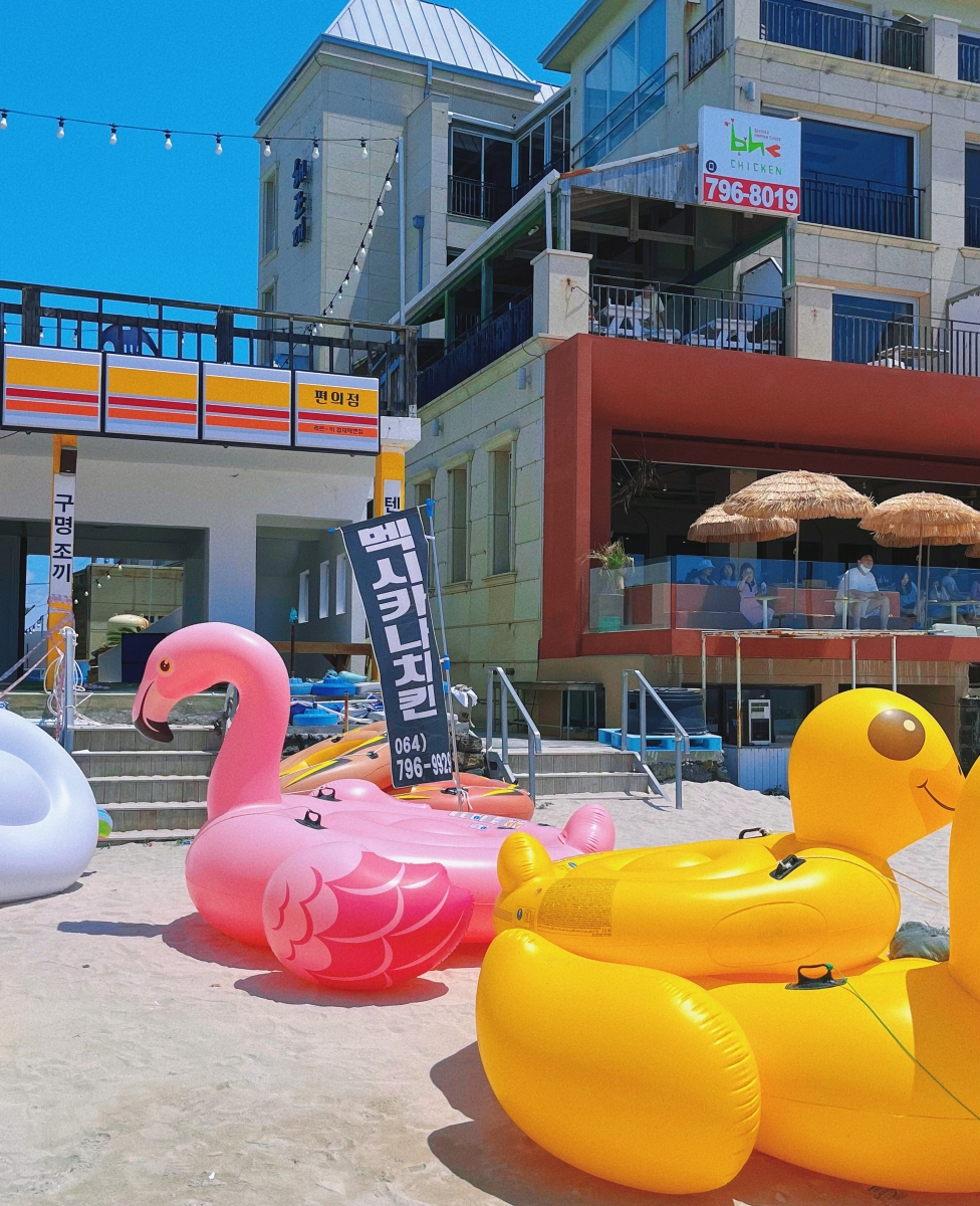 沿海能够看见许多道地小吃摊、堆积如山的游泳圈、太阳扇出租等十分有夏天充满活力的感觉!让人忍不住想扎进清澈的海水水里畅游一番~~ 若旁晚没有行程安排不妨前来欣赏济州岛最美日落。