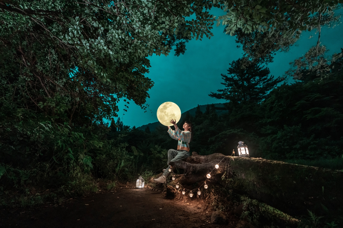 白天打卡的照片很多,何不来个完美的夜景照呢?月亮停留在手中的浪漫夜拍可有听说过呢!济州岛的人工光害较少,而来自SUM's Self Studio的专业摄影师Jay以广阔无垠的济州岛夜空作为背景,森林之上深邃的宝蓝色夜空衬得手上停留的月亮更加耀眼!