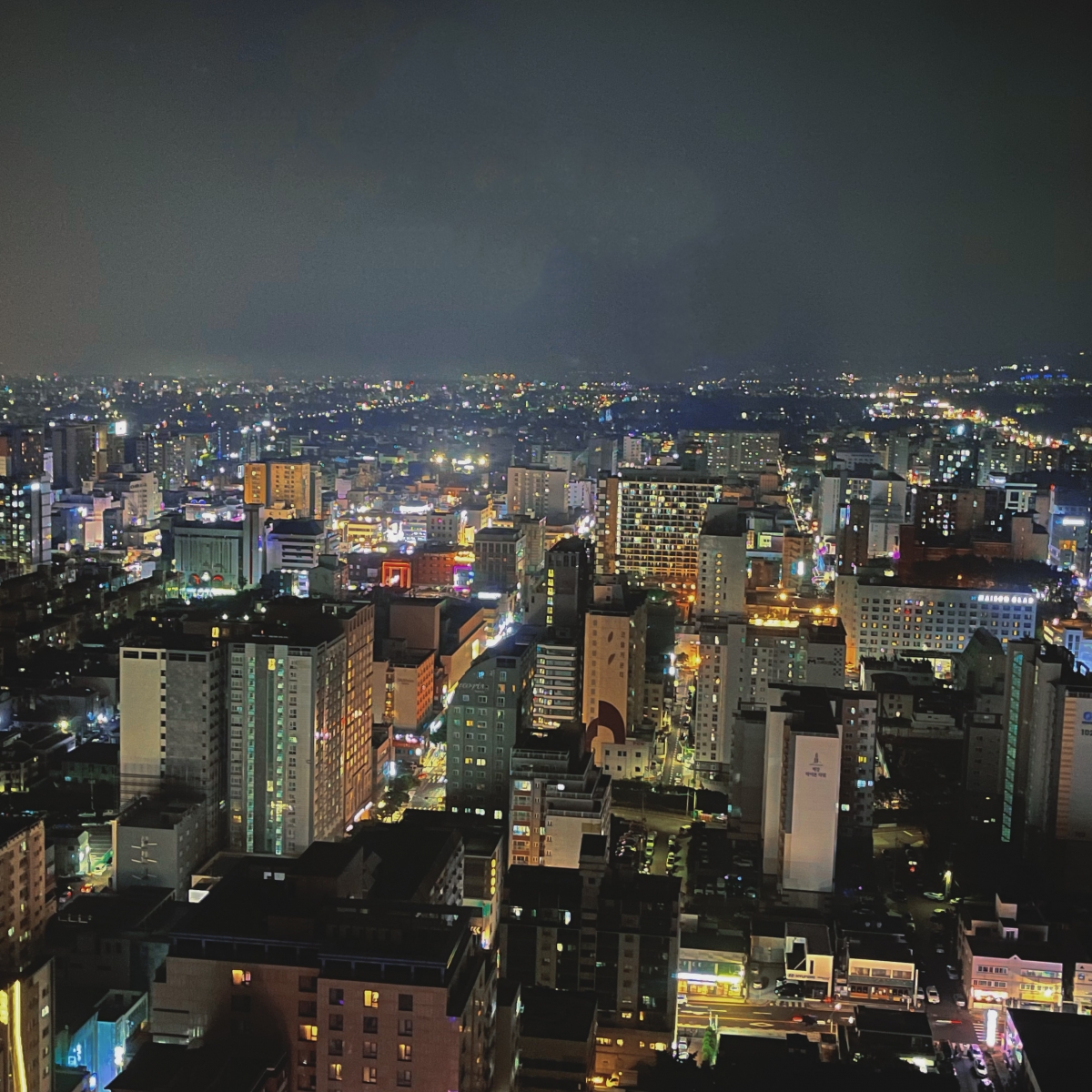 夜色中伫立于Jeju Dream Tower内的Grand Hyatt旅馆更显梦幻,而从旅馆落地玻璃窗一眼望去的济州岛夜景进入眼帘!