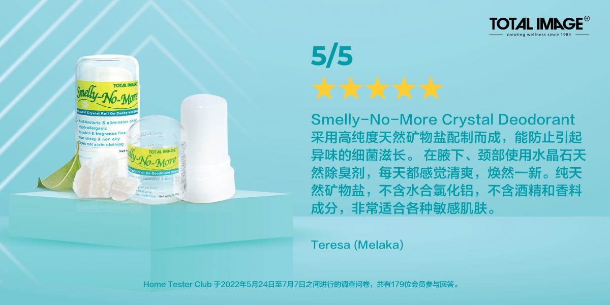 而Home Tester Club 于2022年5月24日至7月7日之间进行的调查问卷,共有179位会员参与回答。Home Tester Club是全球最大的购物者网上社区,200多万会员加入并拥有数千种真实产品评级和评论,旨在为大众在购物选择做出最佳决定!而Smelly-No-More Crystal Deodorant更荣获4.5星的好评(满分为5颗星)⭐
