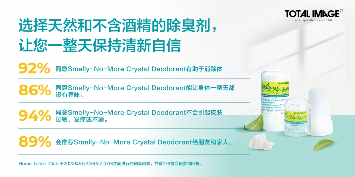 - 86% 反馈使用 Smelly-No-More Crystal Deodorant 能够有效保持全天候无异味。
