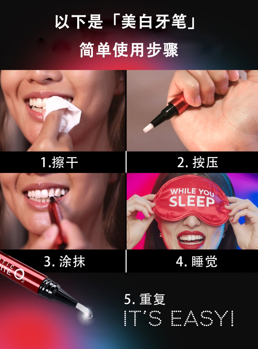 嘿嘿!除了刷牙之外,想要再 Double UP 加强美白功效吗?那一定要在睡前刷牙后使用 —— 全新 O2 Teeth Whitening Pen 美白牙笔!它同樣具備创新的活性氧美白技术,睡前轻轻地把美白精华涂在牙齿上,便能在入眠期間美白牙齒,為我們的牙齒提亮三个色度。这也太方便和强大了吧,没想到睡觉也能美白牙齿!