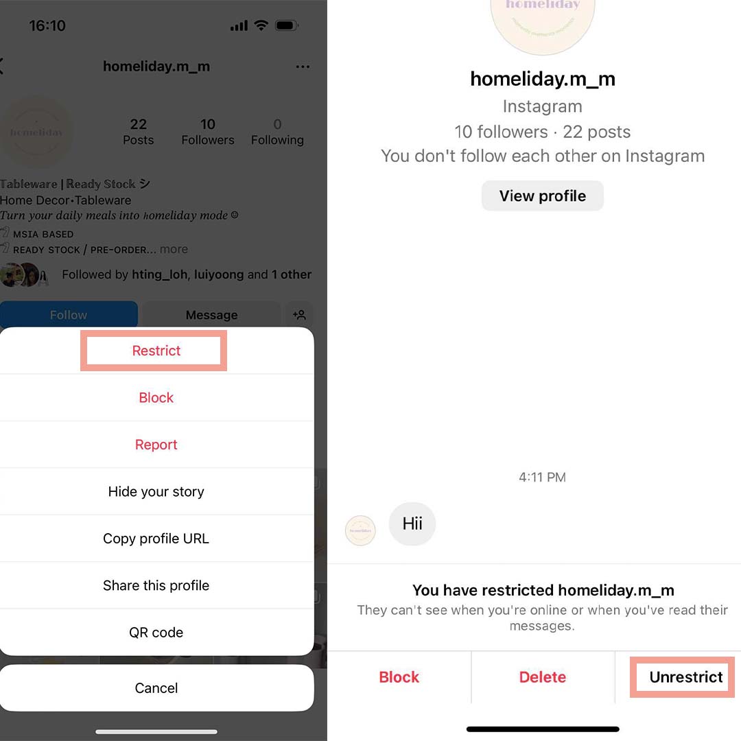 - 方法(2):还有一个技巧就是直接到对方的 Profile 设定「 Restrict」封锁 TA 的账号再回到 IG 聊天室,在对方毫不知情情况下轻松偷看 TA 的信息~想要回复 TA 的信息取消限制即可。