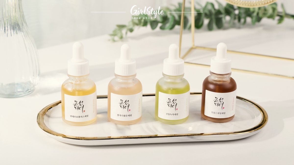 精华液都是韩星和网红绝不会忽略的保养步骤。来自 Beauty of Joseon 精华液系列能够针对不同的肌肤问题提供最全面解决方案。 (1)Revive Serum 含有 63% 人参和 3% 蜗牛粘液,还有松茸、山茱萸提取物,能让肌肤具备强大的修复能力,从而减少皱纹产生、色素沉淀以及爆痘发炎的问题。(2)Glow Serum 内含的 60% 蜂胶提取物和 2% 烟酰胺可以为肌肤补水改善油水平衡还能悄悄击退黑色素令肌肤变得白皙透亮!(3)Calming Serum 非常适合痘敏肌姐妹使用,76% 的绿茶提取物、2% 泛醇和維生素 C,可起到舒缓镇静的功效,令红肿敏感的肌肤能马上得到良好的呵护,保湿、美白和抗衰老的效果也能一步到位重现陶瓷光肌好皮状态。(4)Deep Glow Serum 主要的米糠水和熊果苷等成分皆能帮你轻松应对暗淡无光的肌肤困扰,使用完后马上白几个度,养出人人都称羡雪白肌!