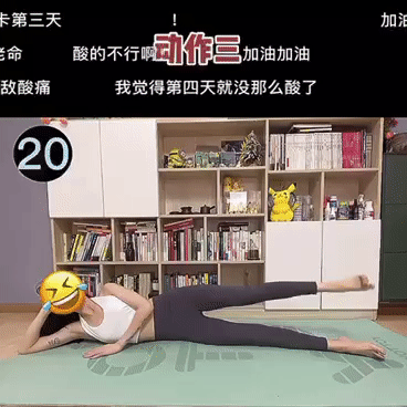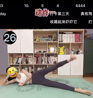 躺在瑜伽垫上,抬起一条腿向前伸,然后把脚尖向内勾,感受小腿拉伸,接着上下摆动,这个动作练起来,你会感受到大小腿和臀部都有酸痛感,一组 40 秒再交替换腿重做一遍~动作尽量慢一点感受臀部至腿部的拉伸感。做的时候最重要保持上半身的稳定,动作标准不求快就行了。
