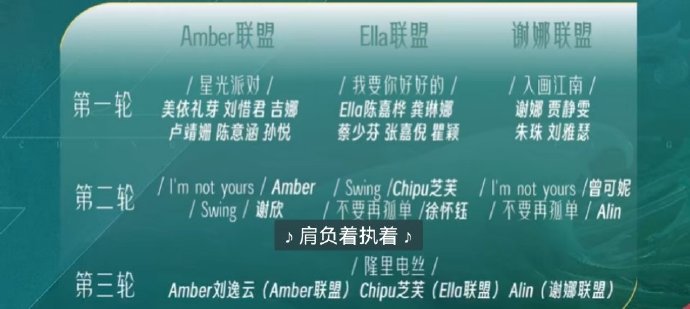 最后是 1 V 1 V1 的 PK,也就是跨联盟合作秀,三个联盟的代表分别是 A-Lin(谢娜联盟)、芝芙(Ella 联盟)以及 Amber(Amber 联盟)。据悉,三个人分别用三种风格来演绎这首歌曲,像是 A-Lin 就挑战了嘻哈说唱,Amber 尝试性感风舞蹈,芝芙则走帅气路线,三个人都在突破自我,呈现给观众不一样的舞台!