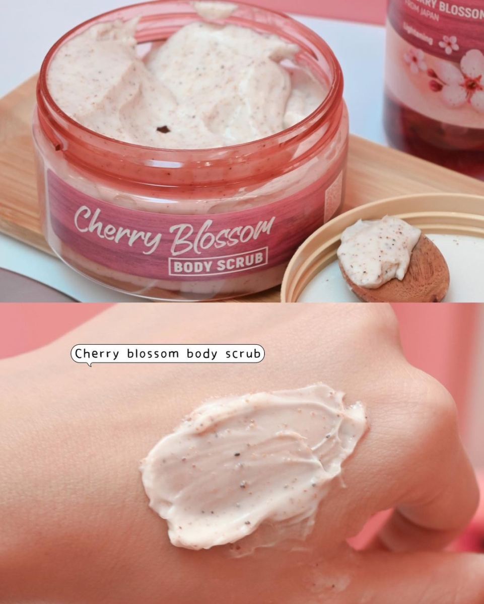每周两次,使用磨砂膏(Cherry Blossom Body Scrub 200g)按摩全身,并在手肘、脚跟和膝盖等比较容易粗糙地区域加大按摩力度,然后彻底冲洗干净。它采用100%天然去角质成分,能够温和地使肌肤更柔滑,让你养出又香又嫩的千金公主皮~