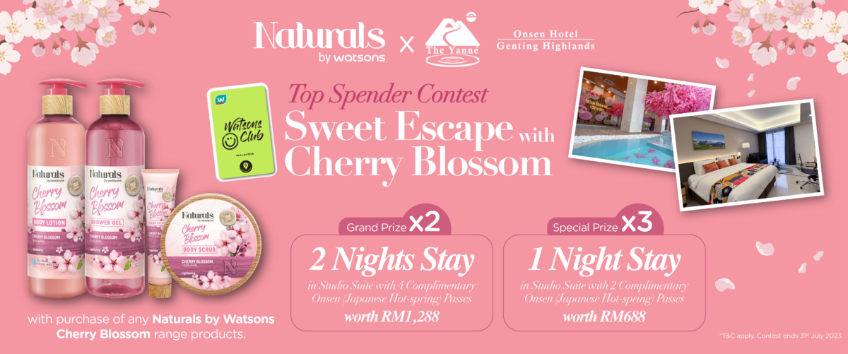 配合樱花主题,Naturals by Watsons这次也联合了The Yanné, Onsen Hotel举办了《与樱花的甜蜜之旅》有奖竞赛!凡是在2023年6月1日至7月31日期间,在线上或实体店购买Naturals by Watsons Cherry Blossom系列的Watsons会员,最终5位最高消费者将赢取价值高达RM4000的Onsen Hotel温泉住宿配套,到云顶高原开启一趟梦幻温泉之旅~