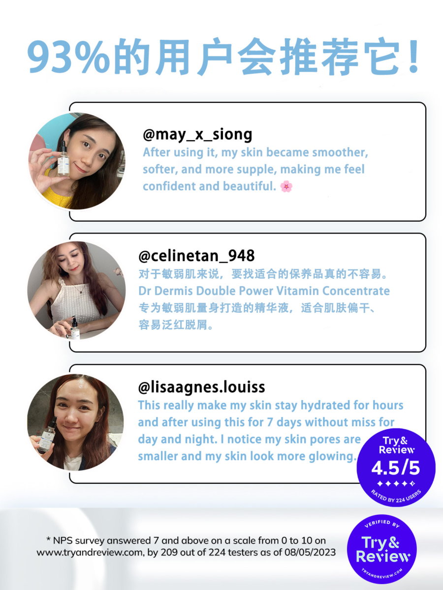 口说无凭!Dr Dermis 的强大功效光靠嘴说不足为证,立竿见影的效果深受许多用户的欢迎!它在知名消费者评论网站 Try&Review 获得 4.5/5 的极高评价,更有多达94%的消费者直言非常高性价比!