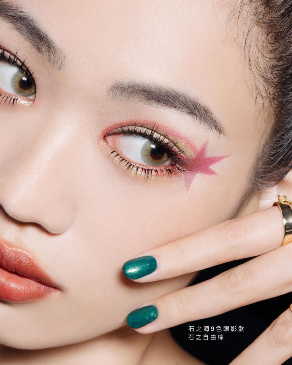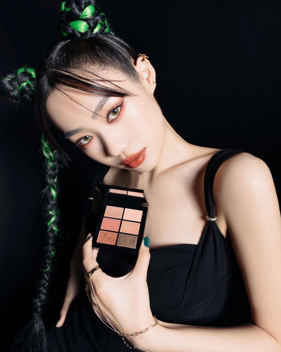 以香港00后混血女神 Mandy Tam 譚旻萱示范的低饱和纯欲妆为例,就是选用了这款裸粉金的眼影,打造甜酷迷人的 look,秋日氛围感瞬间拉满!且质感亮面的包装上印有两个主角的精致肖像,JOJO 迷一定要收藏!
