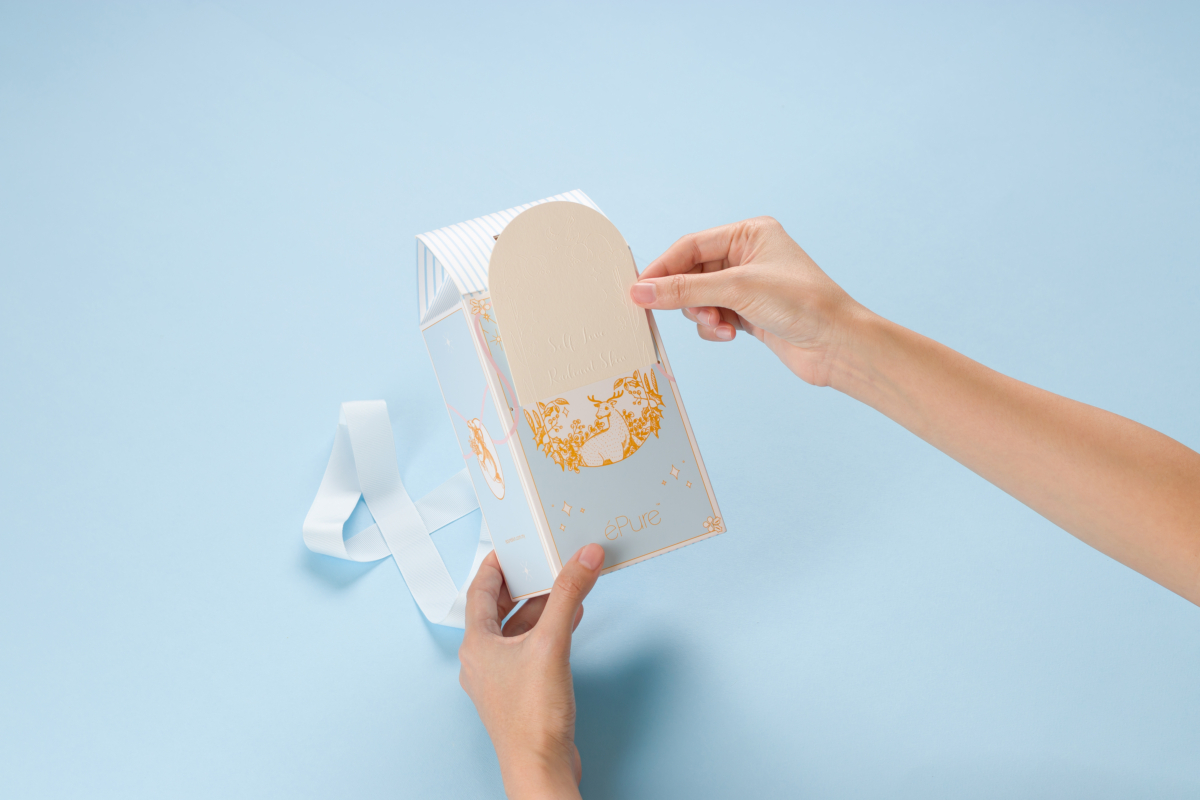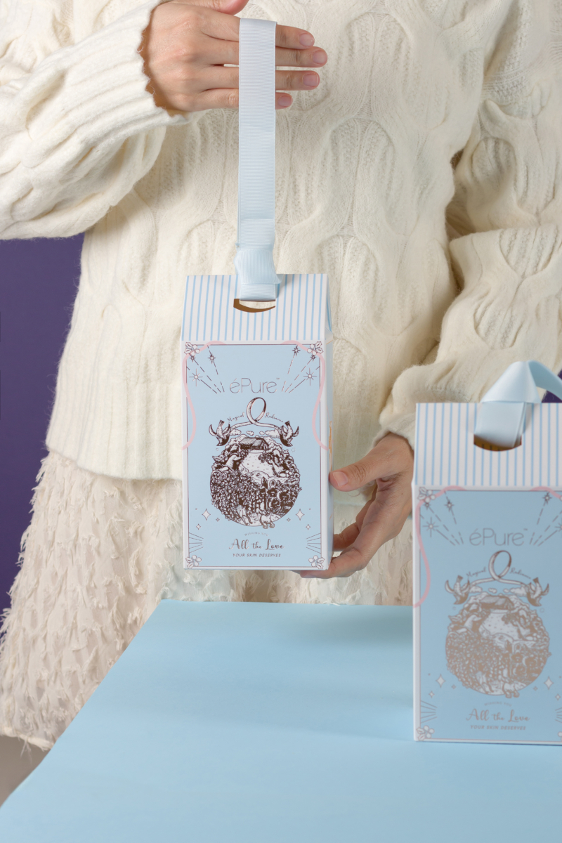 除了产品本身好用之外,今年的圣诞节 éPure 也精心设计了这款梦幻的外包装礼盒,采用 éPure 品牌色——粉蓝色,作为整体设计的主色调,印上金色的圣诞节相关图案,更搭配米色浮雕贺,写上你对TA的圣诞祝福,仪式感瞬间拉满!