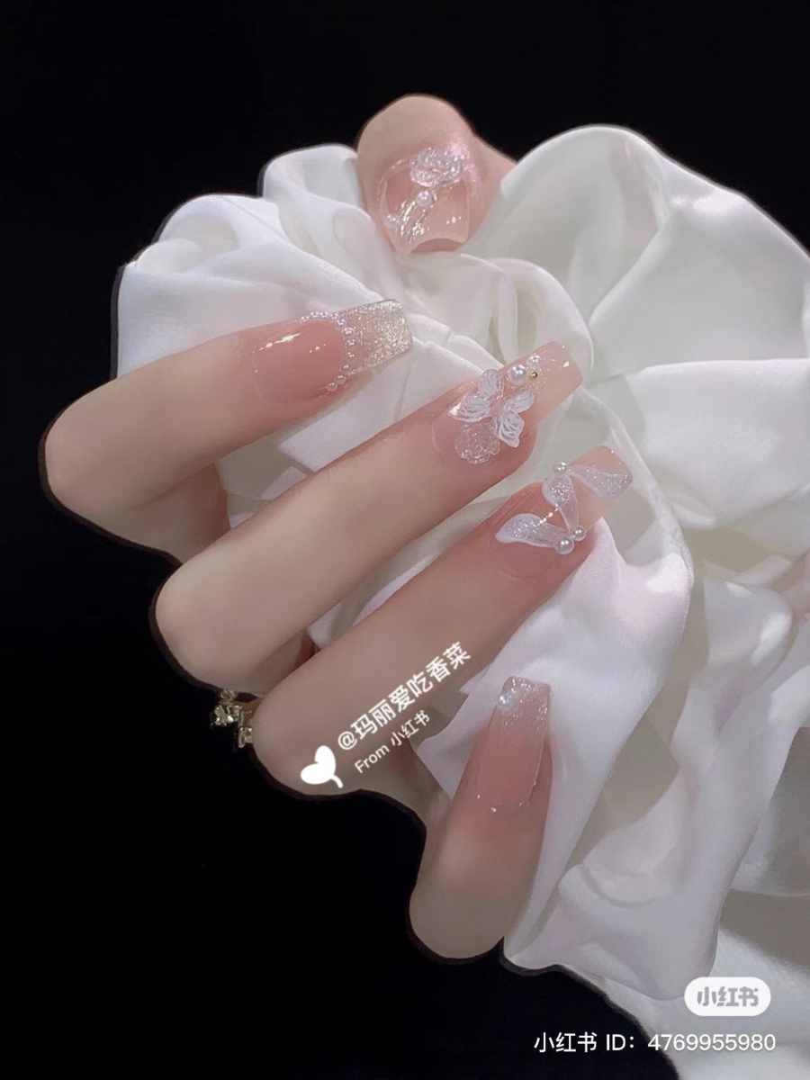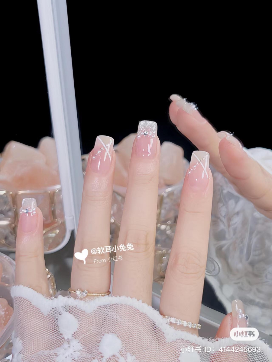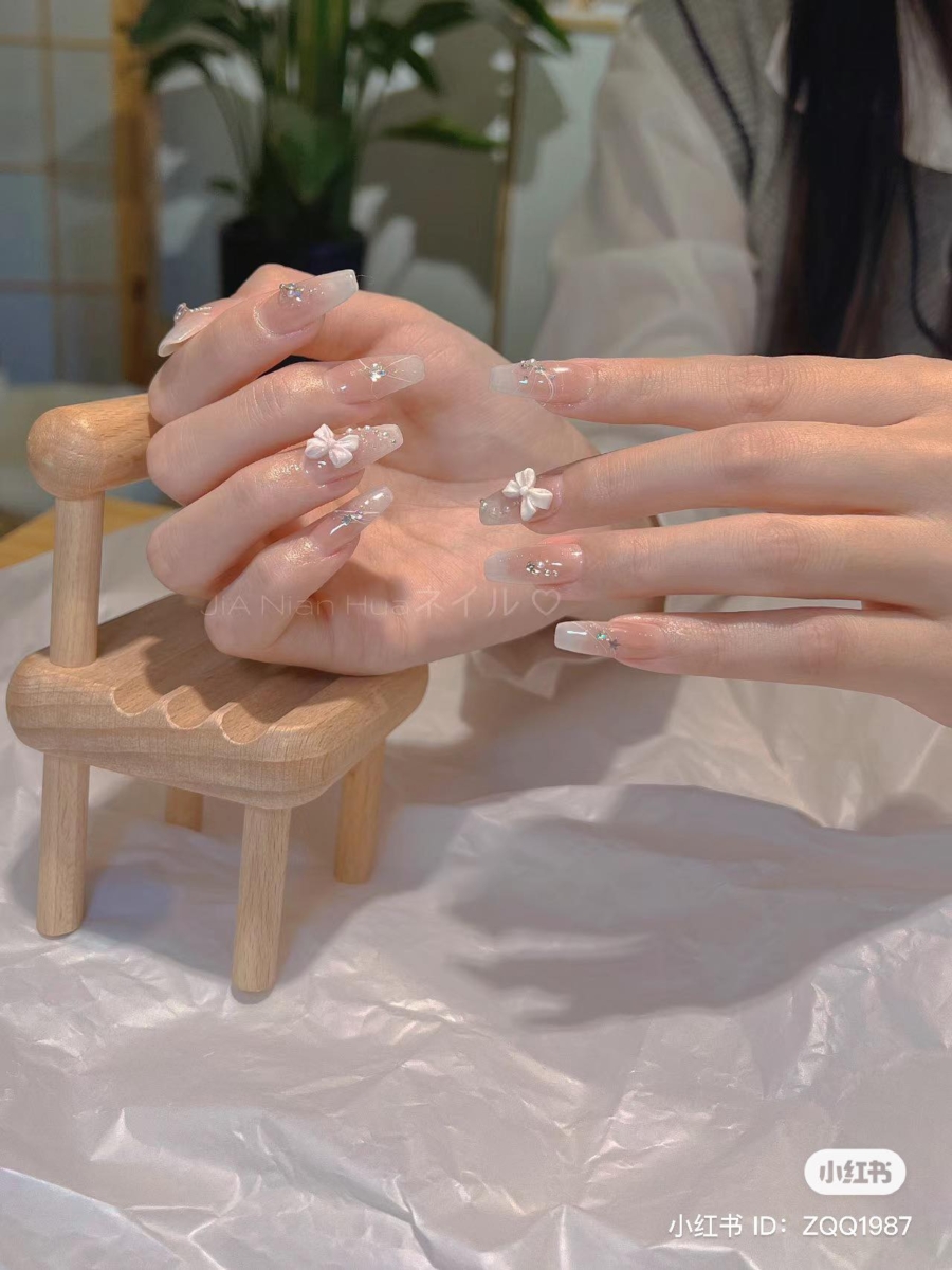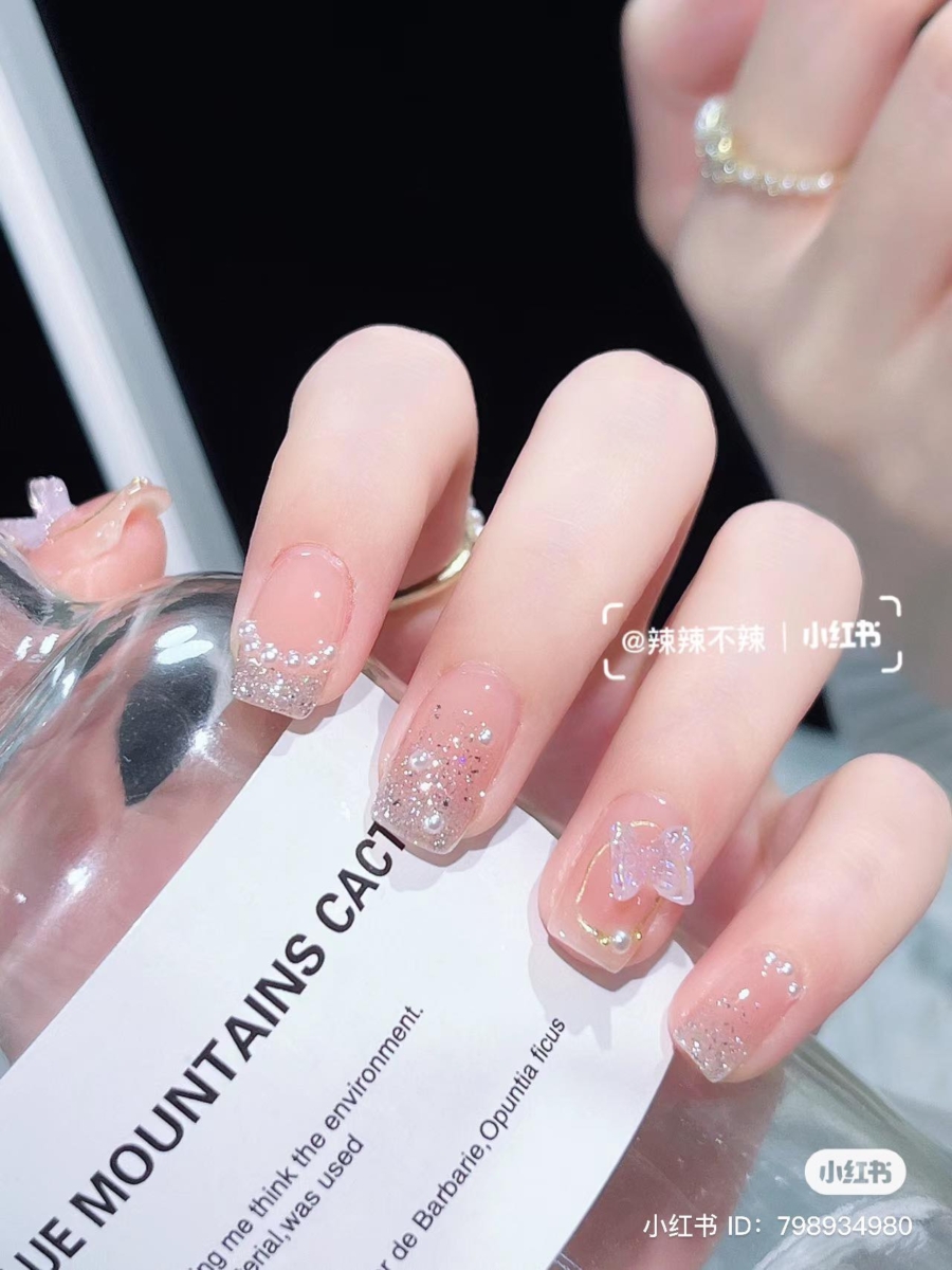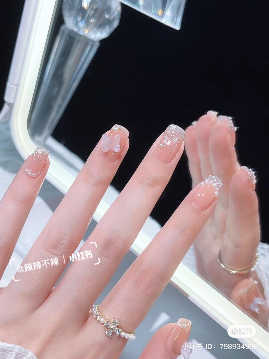 实则~裸色系透明美甲也非常适合结婚的女孩!全白色系的细钻打底,做起来真的很仙气飘飘,重点是也超显手白~