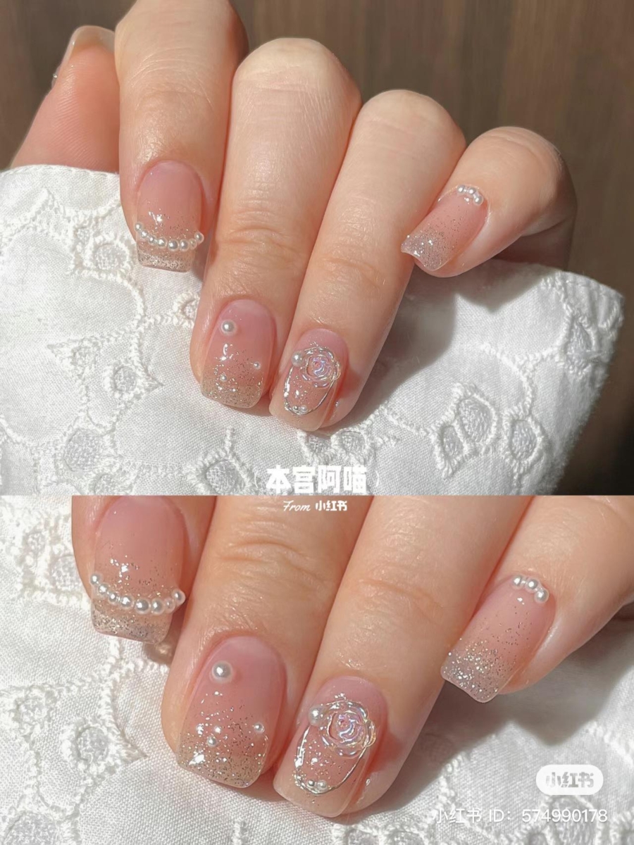 各别在食指、中指和小指粘上全圆的小珍珠~然后在无名指上贴上玫瑰立体点缀以及不规则形的圆框,轻松 GET复古文艺又带有优雅的韵味 !