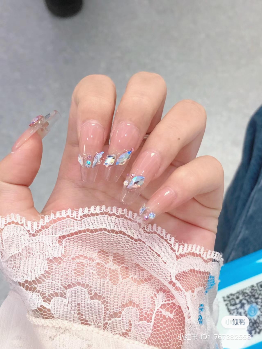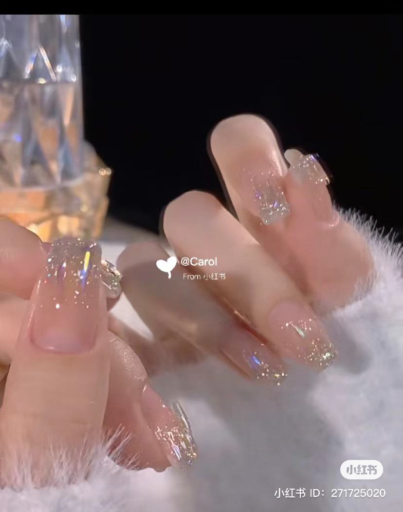 温精灵同款!冰透水润感的美甲,极简温油不失冷艳,马上让你成为全场焦点。底部打底两层淡淡的玉脂色,加两层银色彩亮片胶,再贴炫彩透明极光钻,不管是在灯光或日光下都能爆闪别人的眼睛。