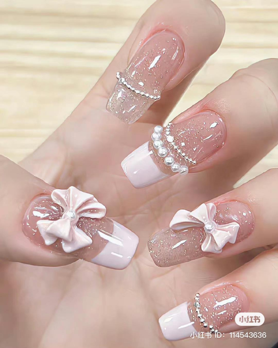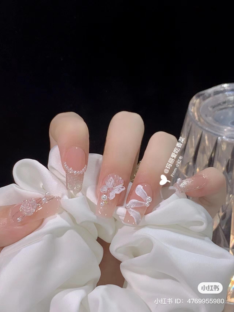 如果你个人超爱芭蕾风穿搭或单品,不妨也能在指尖融入芭蕾风元素。透明闪钻作为打底色,在延长的指甲中加入颗颗分明的珍珠以及银钻作为点缀,瞬间让平平无奇的透明基底变得闪耀迷人,让你举头手足间都能散发优雅气质。
