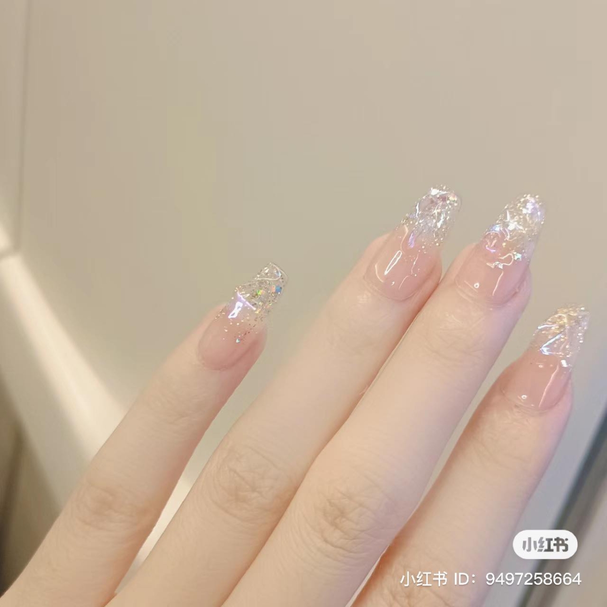 如果你是偏向极简主义,那么这个冰透琉璃美甲系列肯定能击中你的心。使用透明打底~呈现完美的裸透感后再加入琉璃碎片,营造出华丽闪耀的感觉,一天到晚净盯着看都可以。