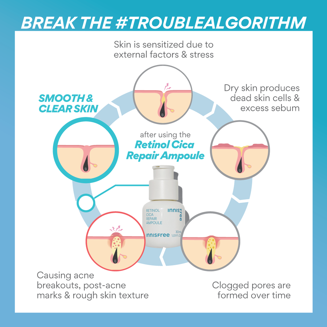 痘痘狂冒导致肌肤出现瑕疵?毛孔堵塞令粉刺增生?空气中的粉尘引起角质代谢变慢?肌肤过敏不稳定?如果你有这些问题,代表你需要Retinol Cica Repair Ampoule!