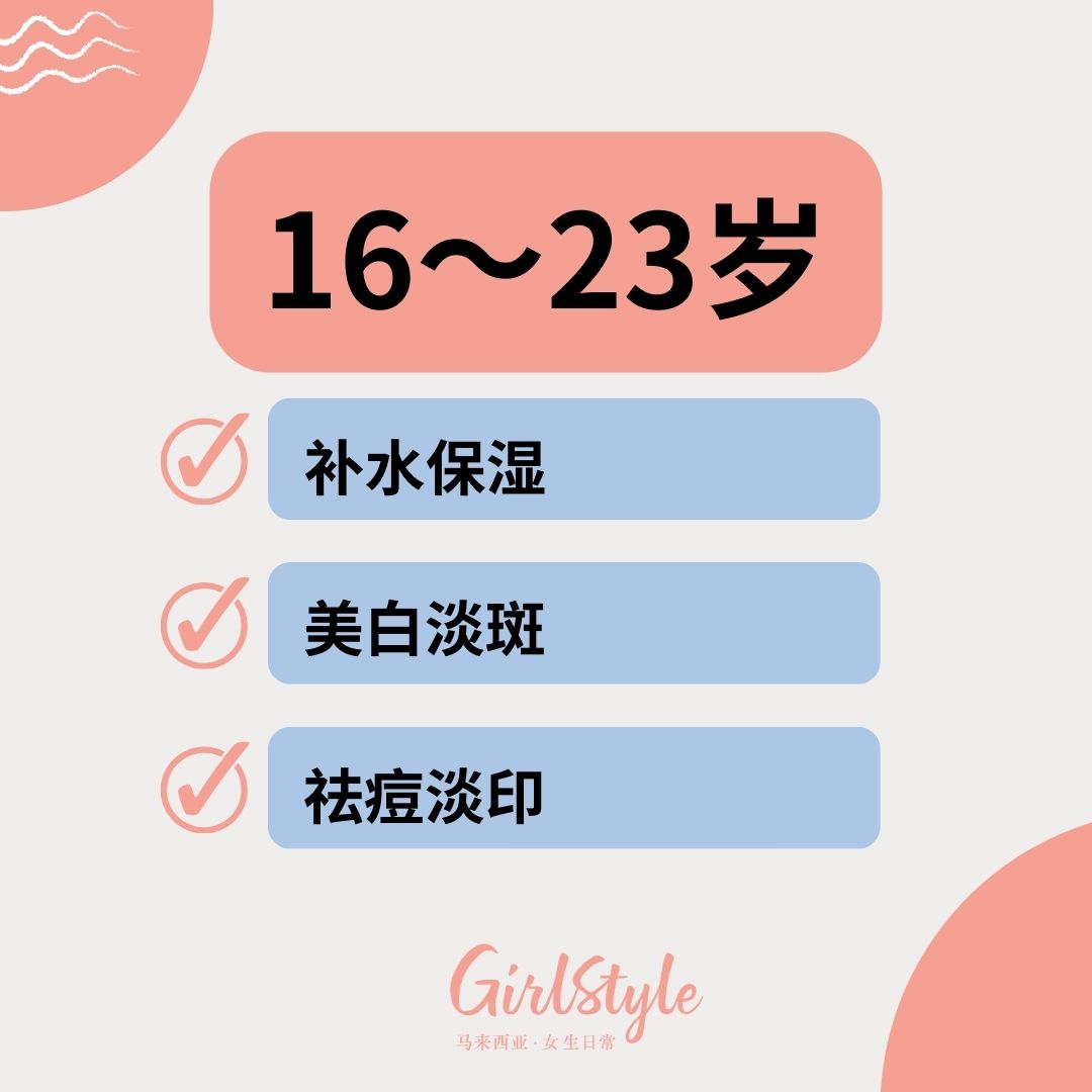 16岁~23岁可说是女生犹如花儿盛开般灿烂的年纪,此时女孩们喜欢尝试不同的妆容,皮肤处于最巅峰的状态,因此相比起抗衰老,更加要注重保湿和去除脸上的斑点和痘印。