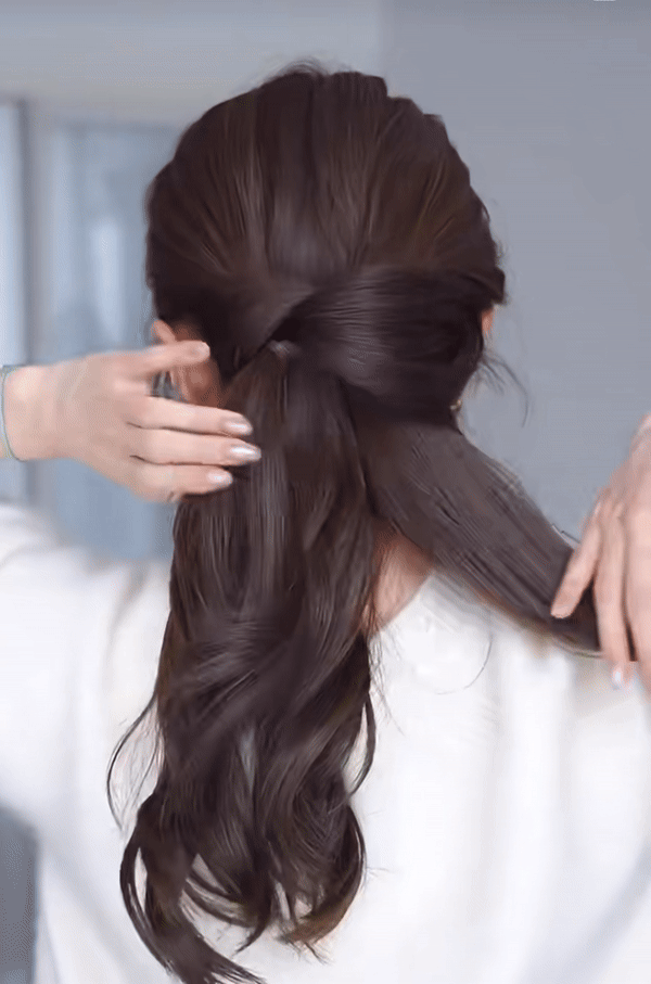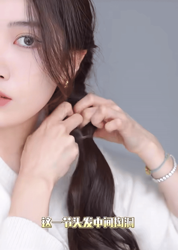 固定好后,它就会形成一截一截造型。再把剩余发束往内翻转进洞,轻轻拨出麻花辫的纹理感。重复这个动作直到扎到发尾为止。