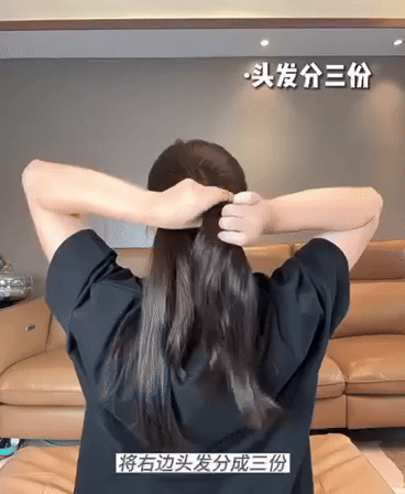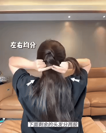 扭到第二圈的时候,跟剩余的头发MIX 在一起然后再均匀地分成两个部分,接着可以用发圈来固定,避免两个方向的发丝参杂在一起。