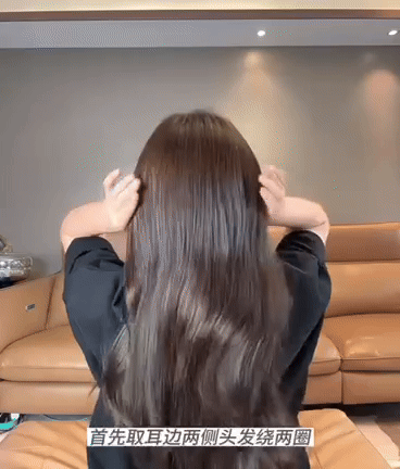 从耳朵两侧取出两撮头发,然后相互绕两圈形成类似麻花辫饼干。这个步骤能很好地修饰头型实现高颅顶,拯救后脑勺扁平头型。