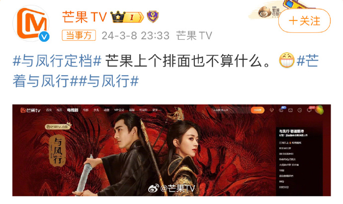 不仅粉丝期待这部剧,各大平台也都押宝《与凤行》,在前期宣传时给足它排面,甚至直接玩起了“商战”,腾讯和芒果 TV 各出奇招,给《与凤行》最好的待遇。