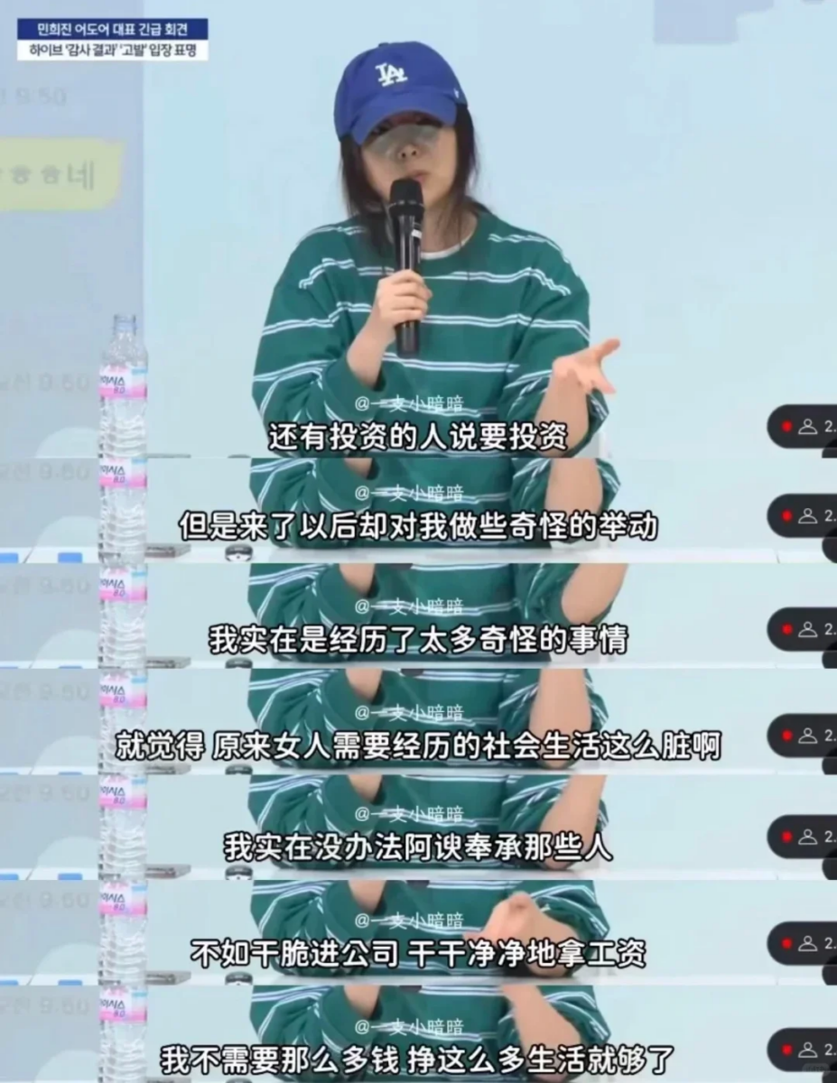 闵熙珍在记者会上全程放飞自我,比起严肃的回应,她更像在做出情绪的宣泄,还忍不住口出脏话,怒骂 HYBE 公司和社长房时赫。然而,她说的话却意外让不少职场上的女性和她共情。