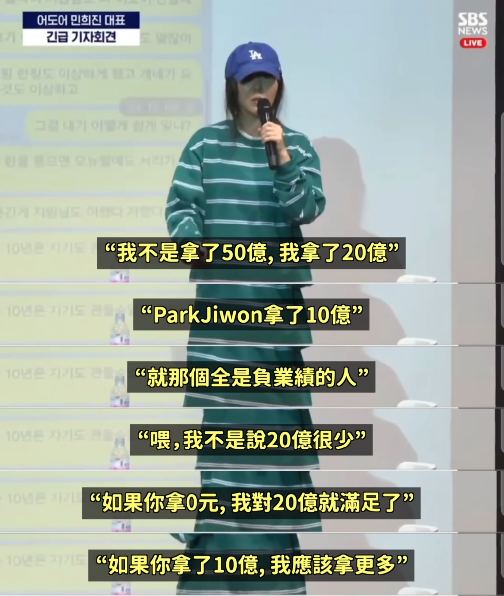「我拿了 20 亿,Park Jiwon 拿了 10 亿,就那个全是负业绩的人。我不是说 20 亿很少,如果你拿了 10 亿,我应该拿更多,如果你拿了 0 元,我对 20 亿就满足了」