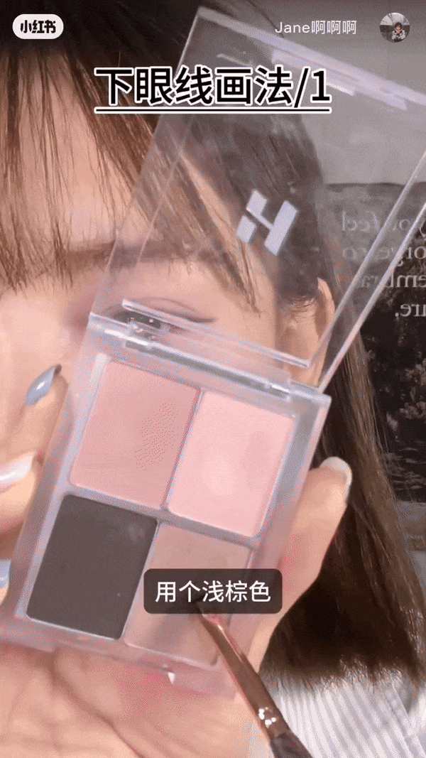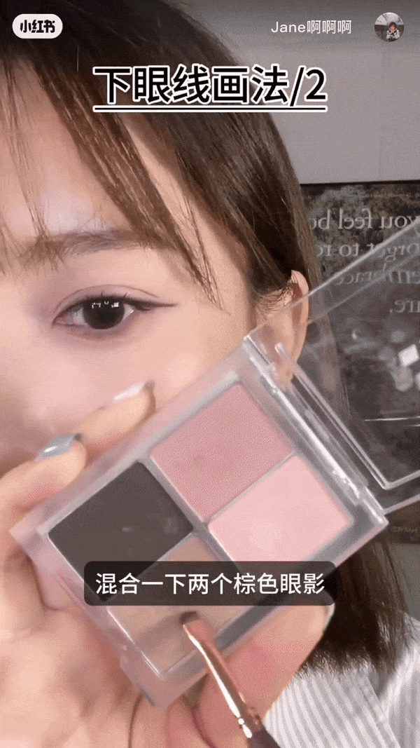 用刷子混合深棕色和浅棕色眼影,贴着下眼睑把眼线画到和上眼线同一个长度(但不要闭合)。画到眼尾三角区的时候,可以把刷子立起来,比较容易控制晕染范围。