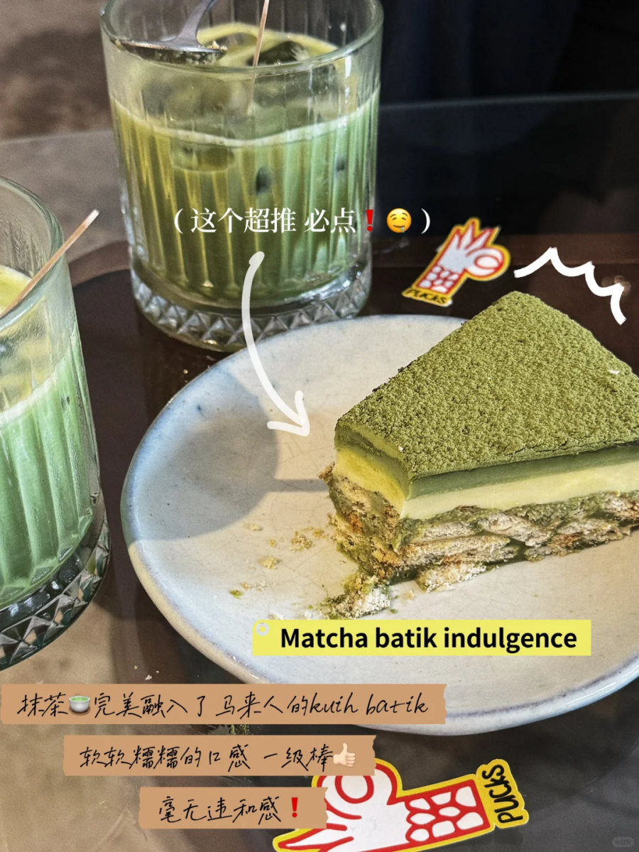 一家融合了木质调和工业风的咖啡厅,主打抹茶口味的蛋糕和饮料~ 小红书网友大力推荐他们家的 Matcha batik indulgence,将抹茶蛋糕和马来传统糕点 kuih batik 融合在一起,口感软糯糯,搭配抹茶馥郁的香气,这个组合让人相当惊艳!