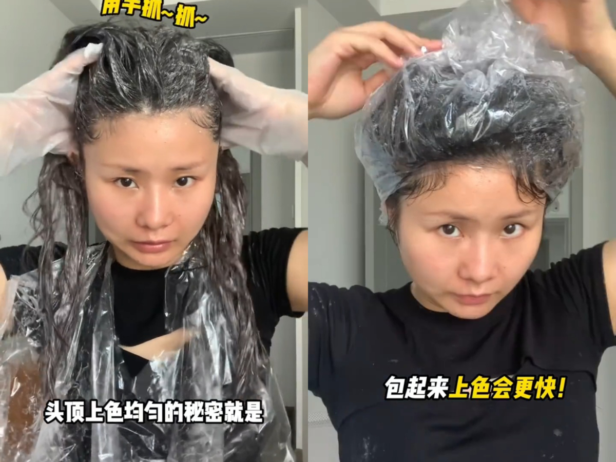 把发中到发尾的部分染完之后,先等个 20-25 分钟,接着就可以染头顶了。按照刚才的方法把染发剂涂上头顶,再像洗头一样用手抓一抓头发,抓得差不多了就用浴帽或是配套的“围兜”把头发包起来,静待 15-20 分钟。