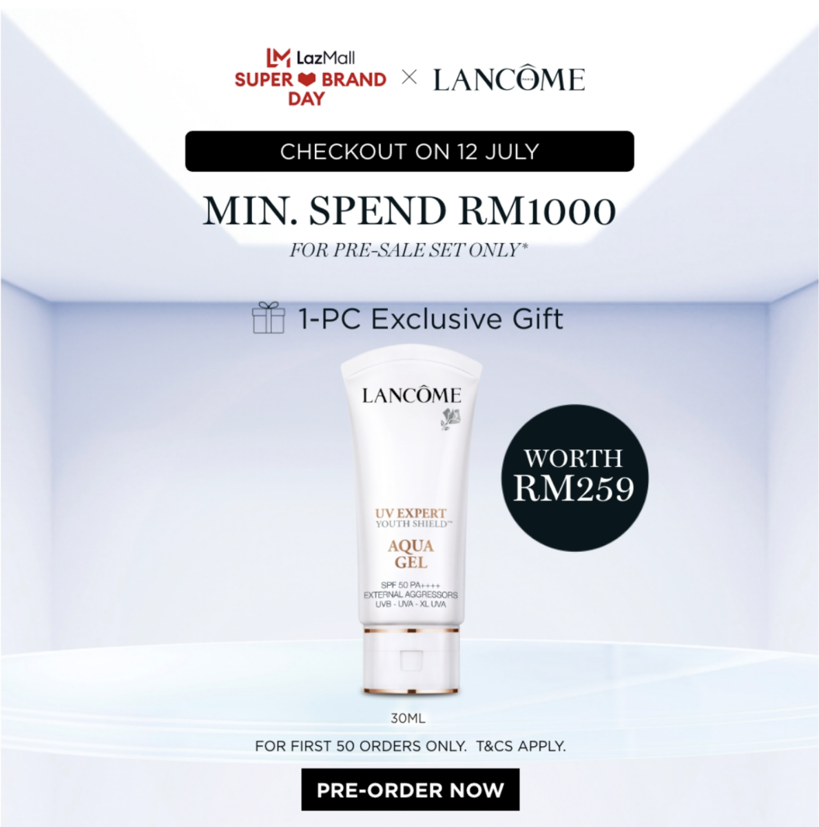 哦对了!在7月12日,12am~12pm期间支付剩余款项的姐妹们,可获取支价值RM132的礼品,首50位订单满RM1000或以上的用户还能得到价值RM259的正装UV Expert Youth-Shield™ Aqua Gel,买到赚到!赶紧号召身边的姐妹闺蜜们一起在来临的Lazada Super Brand Day x Lancôme 预售促销下单吧,这么诱人的优惠入手绝对不亏!