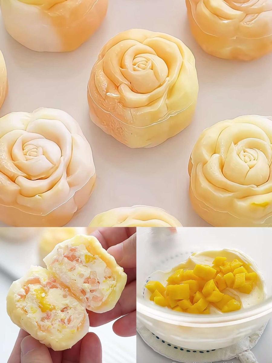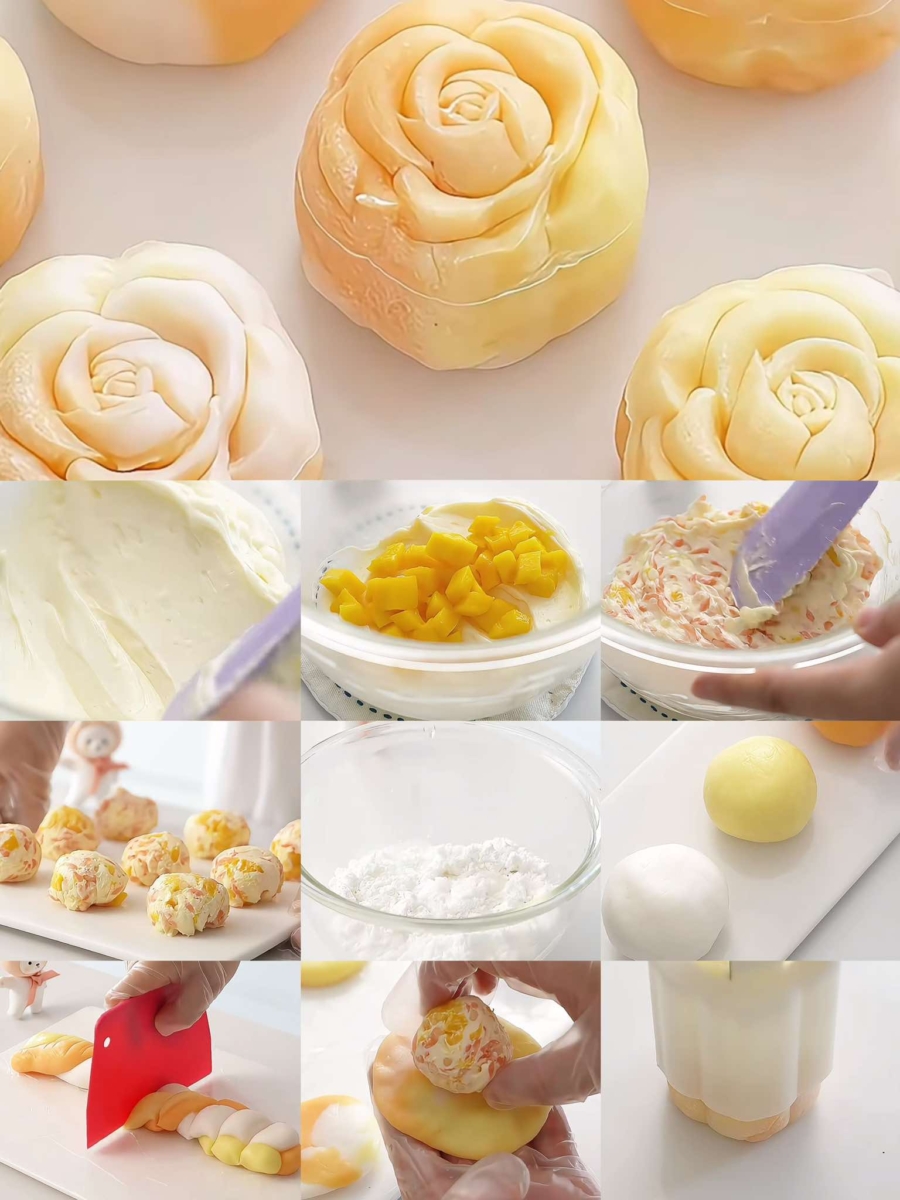 - 将冰皮压扁,包上杨枝甘露馅,撒上熟糕粉,用50g月饼模具压出形状即可。