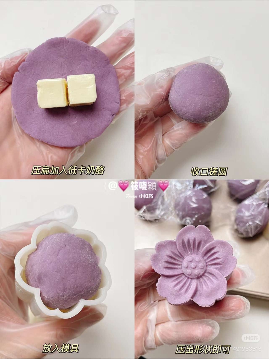 1、先制作紫薯馅。紫薯切块,上锅蒸20分钟至软。加入淡奶油搅打成泥。锅里开小火放入黄油,倒入紫薯和炼乳翻炒成团。做好的紫薯的,每份20克揉成团备用。