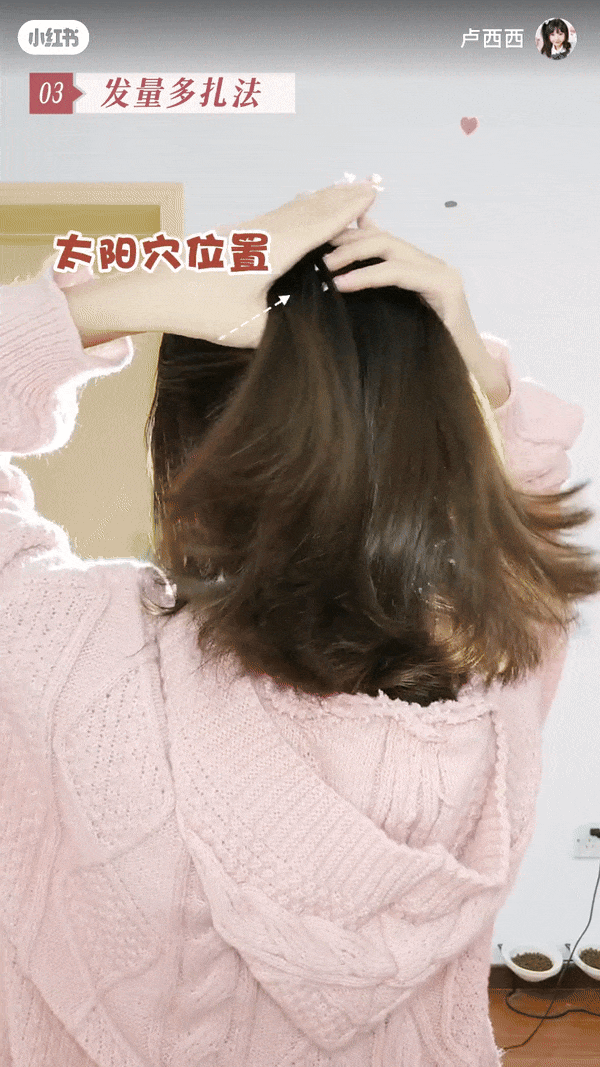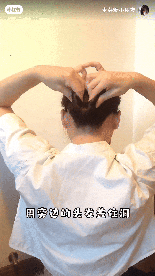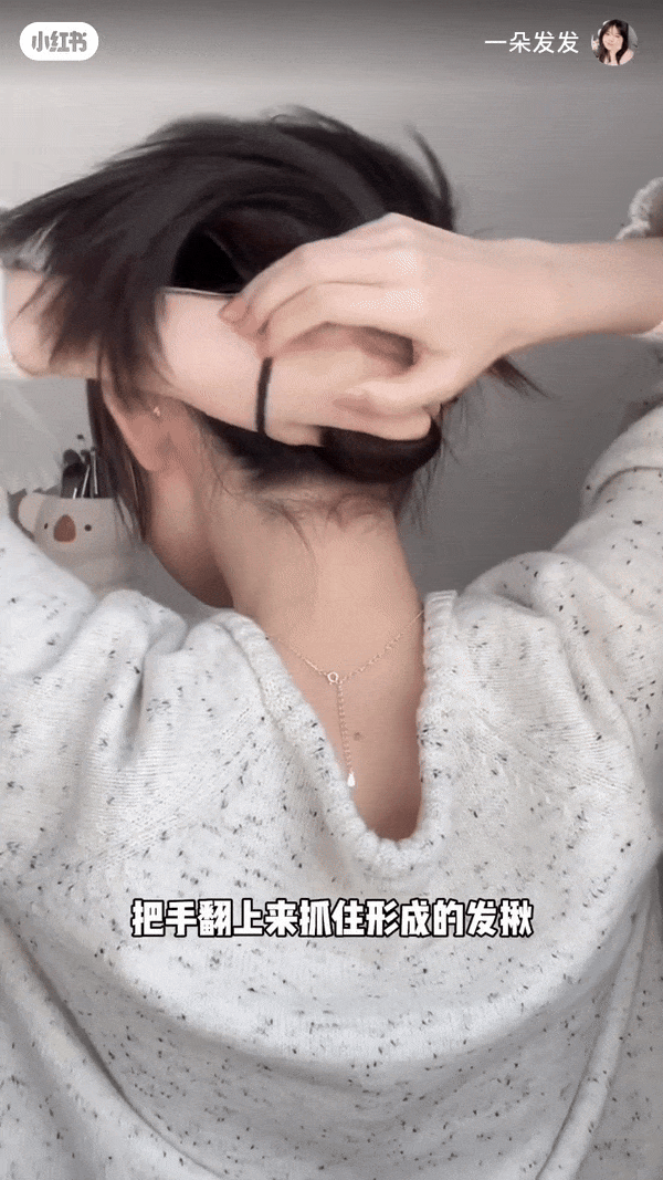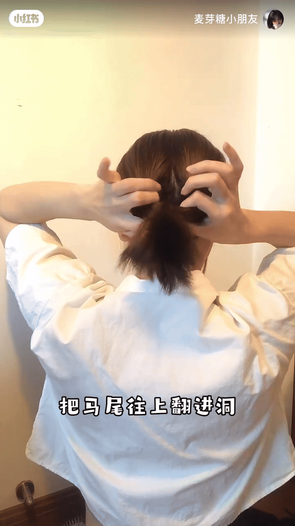 Step 3:用食指和大拇指抓住刚刚的发尾,向上穿过洞掏出来,拉紧然后调整位置。最后适当地把后脑勺头发拉扯蓬松就完成了~