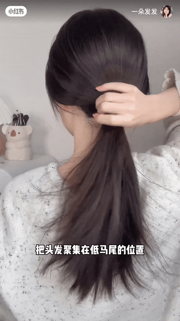 Step 1:把所有头发扎成一个低马尾,最后一圈不要全部掏出来,留出一个小丸子。