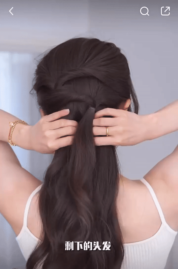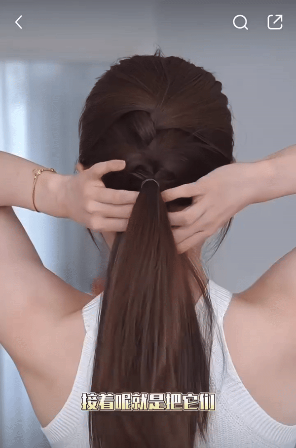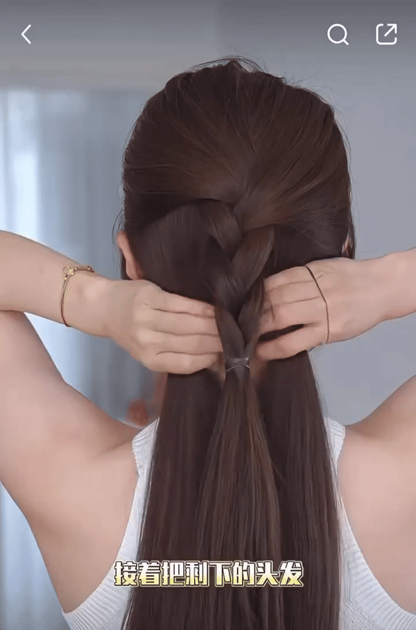 STEP 5:最后,在1号辫子靠近发圈部位掏个洞,将二号辫子穿过去,融合在一起后分成三份绑成三股辫即可。