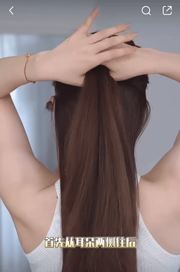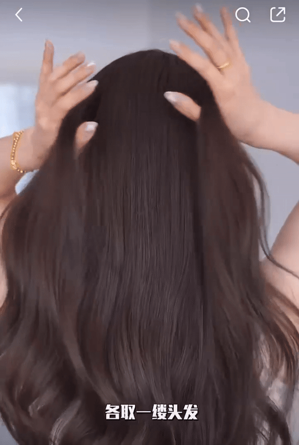 STEP 3:两个发束翻转之后会形成有层次的纹理感,再拉松后脑勺营造出蓬松感。