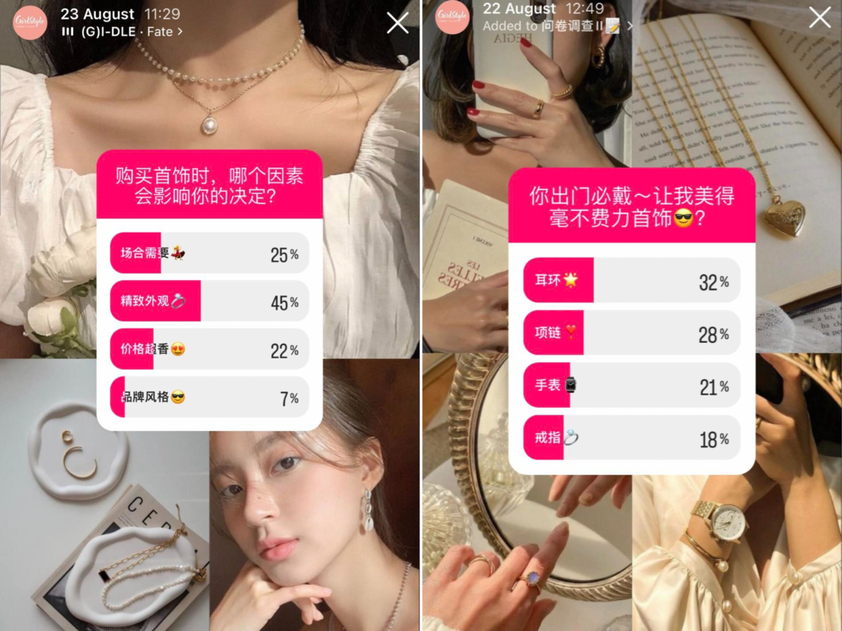 为了更了解女孩们对饰品的追求,GSMY 在 IG 进行趣味小调查,发现大部分人(45%)是因为精致的外观而入手首饰,其次则是因为场合需要(25%)。而大部分女孩(32%)出门必戴的首饰是耳环,接下来是项链、手表和戒指。你对必戴首饰又是什么呢?欢迎留言和我们分享~