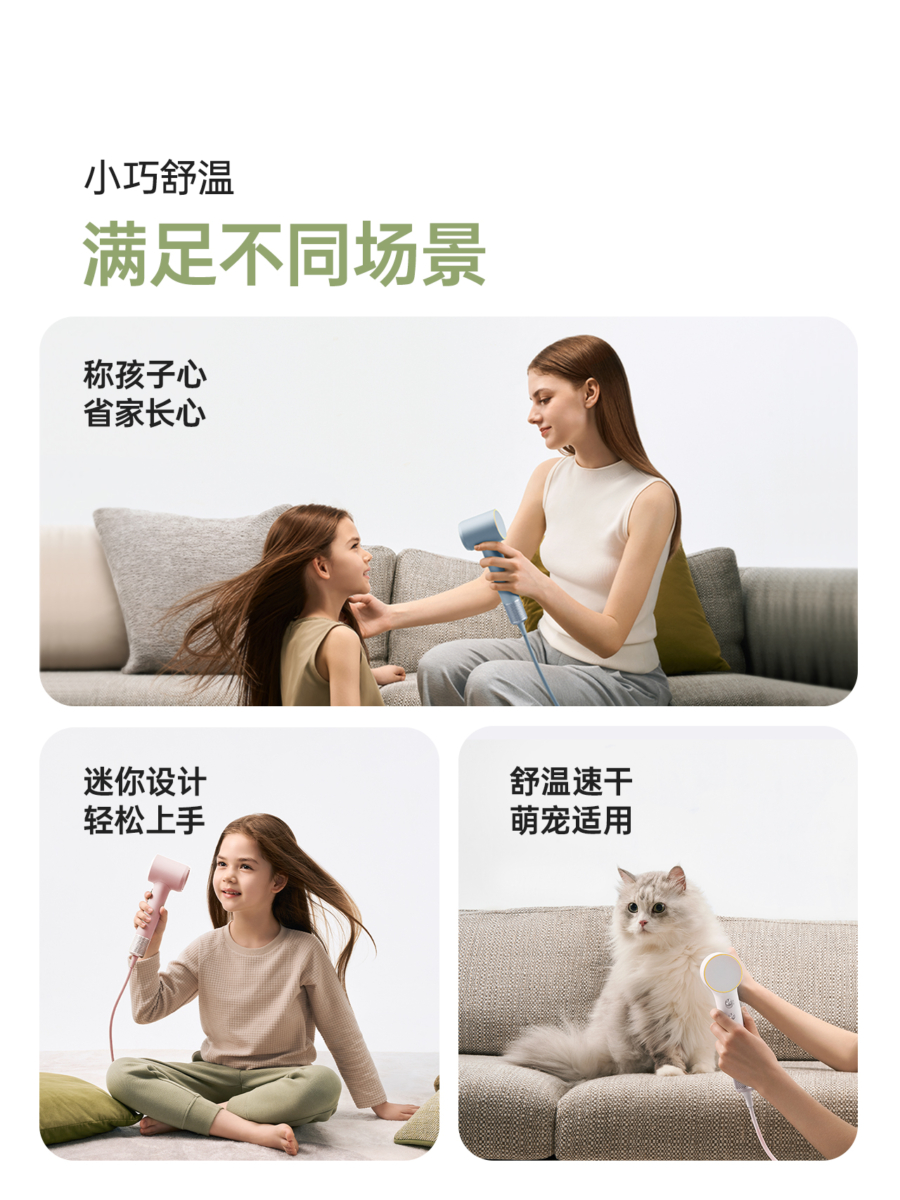 每一款Laifen高速吹风机都内置微处理器智能芯片和温度传感器,在智能温控这块真的太强大,美编在这宣布它是最适合宝妈们的吹风机!全新迷你高速吹风机在智能温控基础上增添了“儿童模式”,只需连按两次温度键,就能马上切换到适合小孩的38度和48度的两档温度,小孩也可以自己动手吹头发啦!此外,这两档轻柔的风速和温度对细软发质的大人也十分友好呢!至于家里有毛小孩的主人们,Laifen同样是个好帮手,温和的温度和强大的风力绝对能让铲屎官剩下不少吹干毛发的时间。