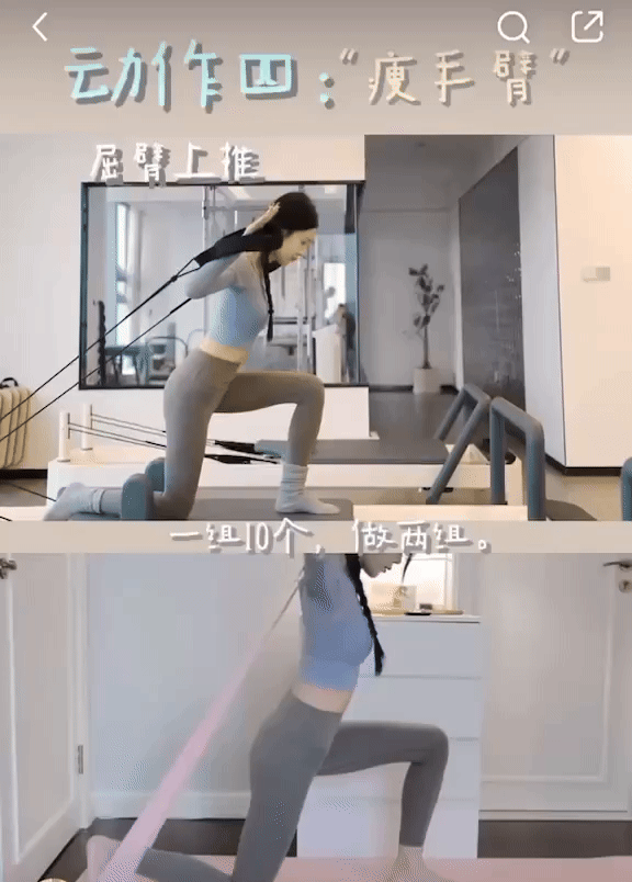 准备姿势:一边的腿向前迈出,另一边的膝盖跪在地上,形成一个弓步姿势。将弹力绳的一端固定在后方的脚上,另一端握在手中。用手臂力量向上拉弹力绳,同时保持身体的稳定。然后缓慢放下手臂,恢复初始姿势。每组做10次,共做两组。这个动作主要锻炼肩部和手臂的肌肉,有助于增强上肢力量。