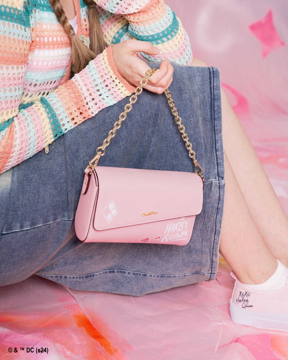 除了菱形图案之外,还有单色为主的粉色和黑色包包。首先是这款粉色链条信封包,经典的翻盖设计并在包身上缀有品牌Logo和Harley Quinn字样,更突显出独一无二的时髦感!