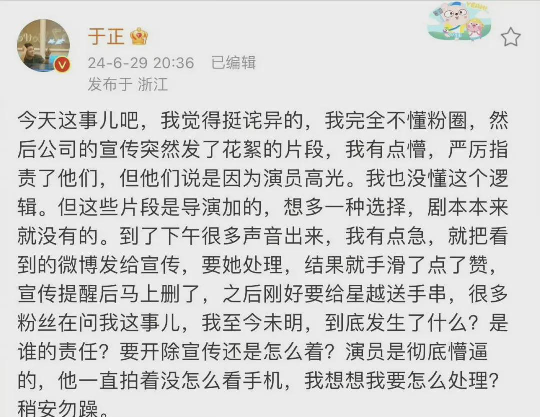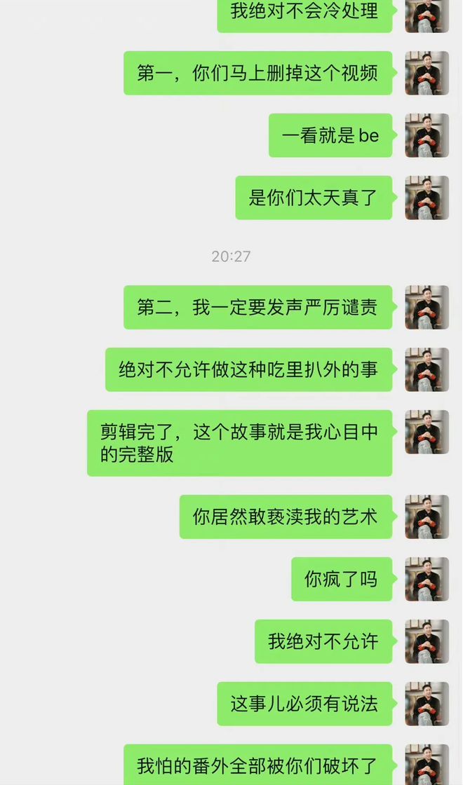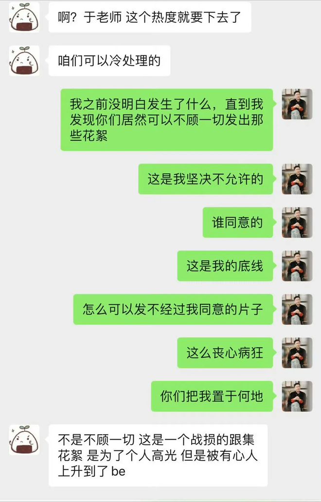 于正也急得出来澄清,还晒出自己和王星越工作室宣传的聊天记录。于正怒斥对方丧心病狂,没经过他的同意就发出这些花絮,而对方则表示「这是一个战损的跟集花絮,是为了个人高光,但是被有心人上升到了 BE」。