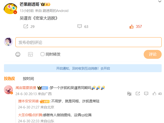 经过这么一闹,不少剧粉对“菲常萧张”的滤镜都碎了一地,感觉没有那么好磕了。与此同时,有消息指吴谨言将飞行《密室大逃脱》,到时候就会和身为常驻嘉宾的「许凯」有同框机会,“傅璎”CP 粉又复活咯~