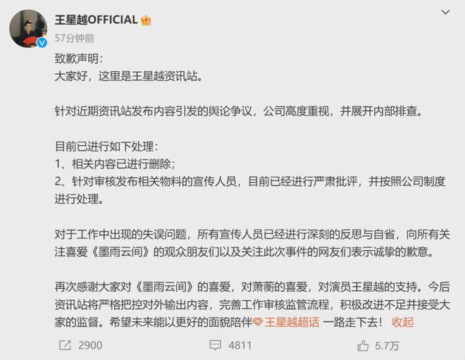 而王星越工作室不仅没有及时补救,还火上浇油,发出一段王星越未播出的”高光镜头“,而这个片段似乎暗示了男主的结局是战死,和剧中的 HE 结局背道而驰,让事情进一步发酵。
